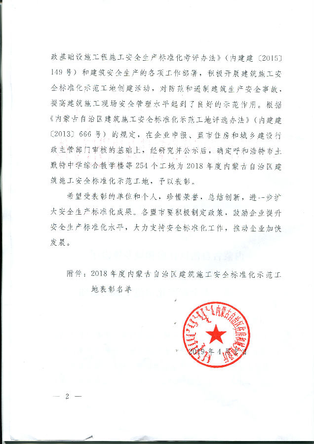 恭喜华远监理公司荣获2018年度内蒙古自治区建筑施工安全标准化示范工地